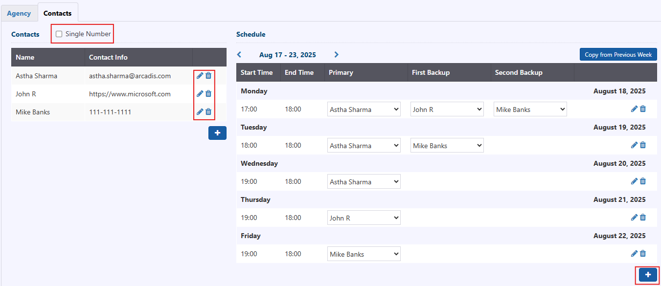 - Schedule: add a shift specified by the day and time window, then select the contact to whom the shift applies