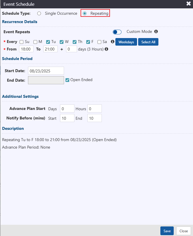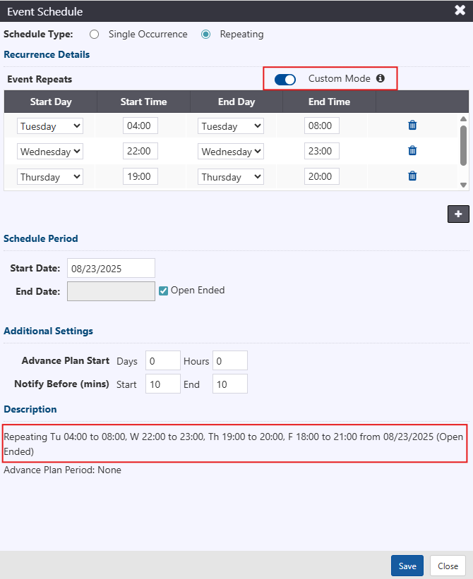 Switch to Custom Mode to enter multi-day occurrences and/or to change the scheduled period by day.