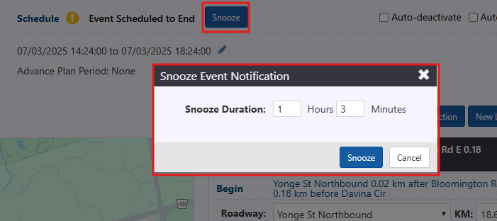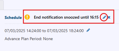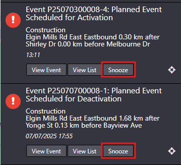 Users can snooze notifications related to the activation or deactivation of a planned event by selecting the Snooze button within the Notification panel.