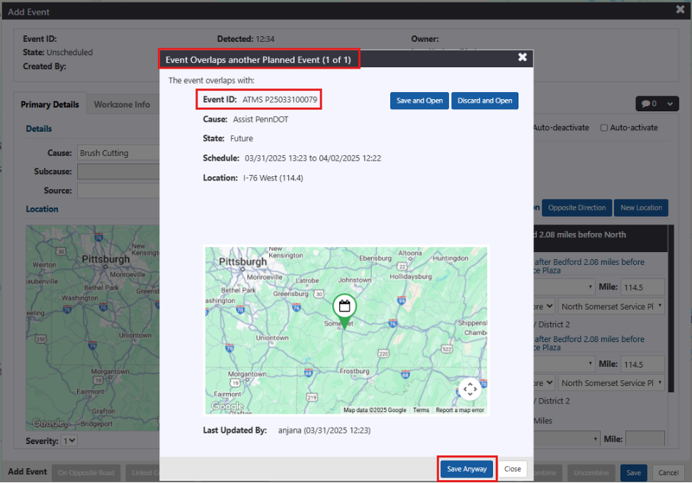 When you attempt to save a Planned Event in ATMS that overlaps temporally or spatially with an existing event, a dialog will appear showing the details of the overlapping event(s).