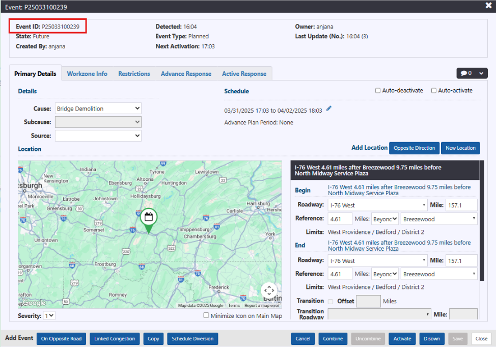 Click the Save button located at the bottom of the Event Details window. The Planned event record will be created. The header of the Event Details window will update to include Event ID, Owner, Update Number and Last Updated time.