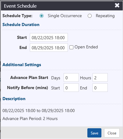 - Notify Before (mins): indicate the number of minutes prior to be notified of the start or end of a planned event occurrence or Advance Plan activation .