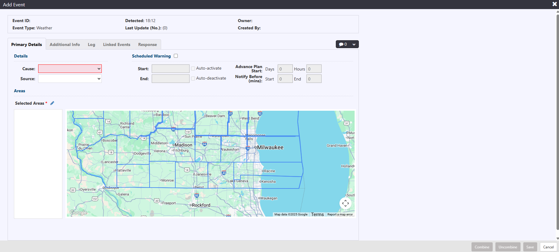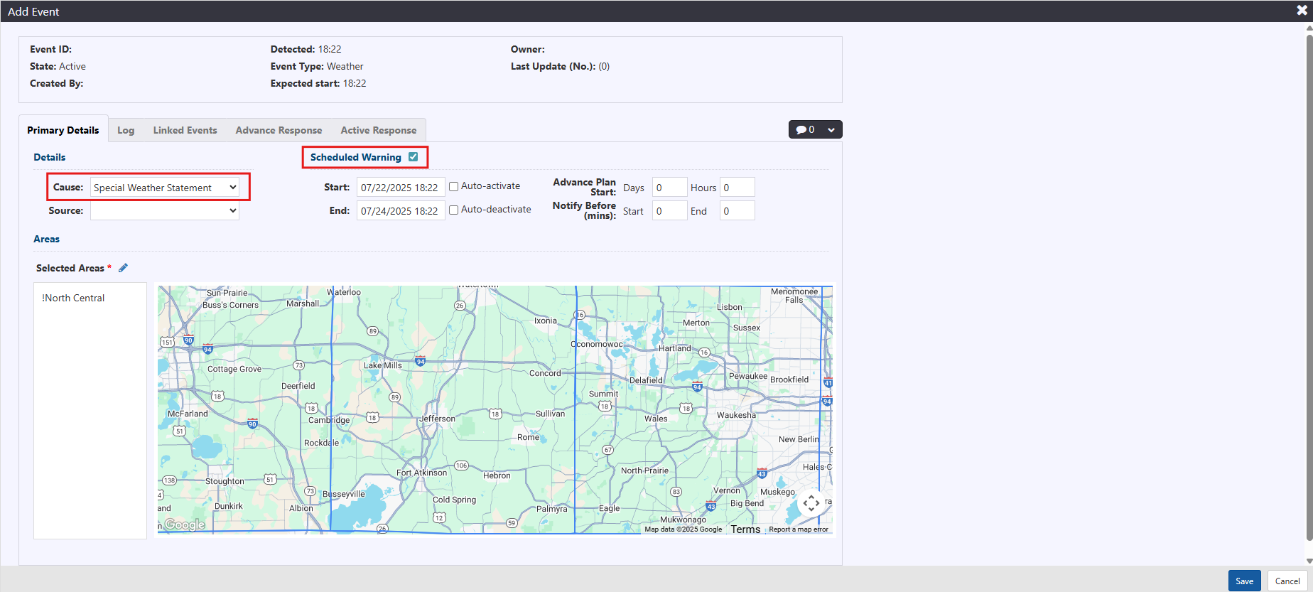 - Scheduled Warning: check the box if an advance warning is to be disseminated through response plan. see section Manage Event Response Plan below for details.