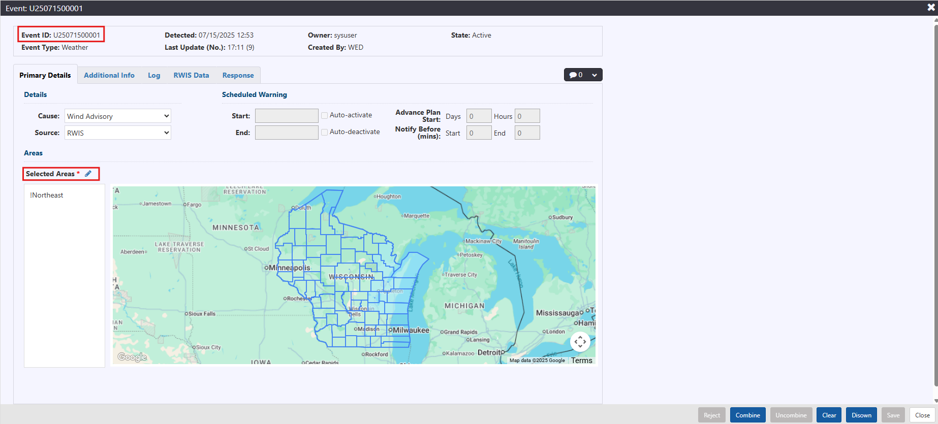 Click the Save button located at the bottom of the Event Details window. The weather event record will be created. The header of the Event Details window will update to include Event ID, Owner, Update Number and Last Updated time.
