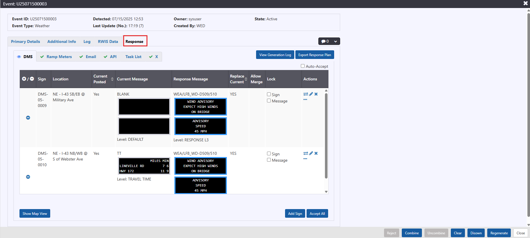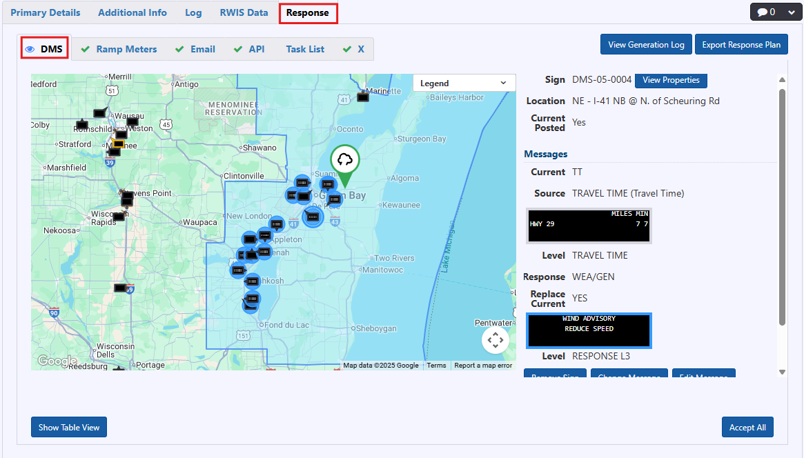 Click each tab to view responses for the event. Under DMS tab, click Show Map View to view the selected signs under the polygon area selected for weather event.